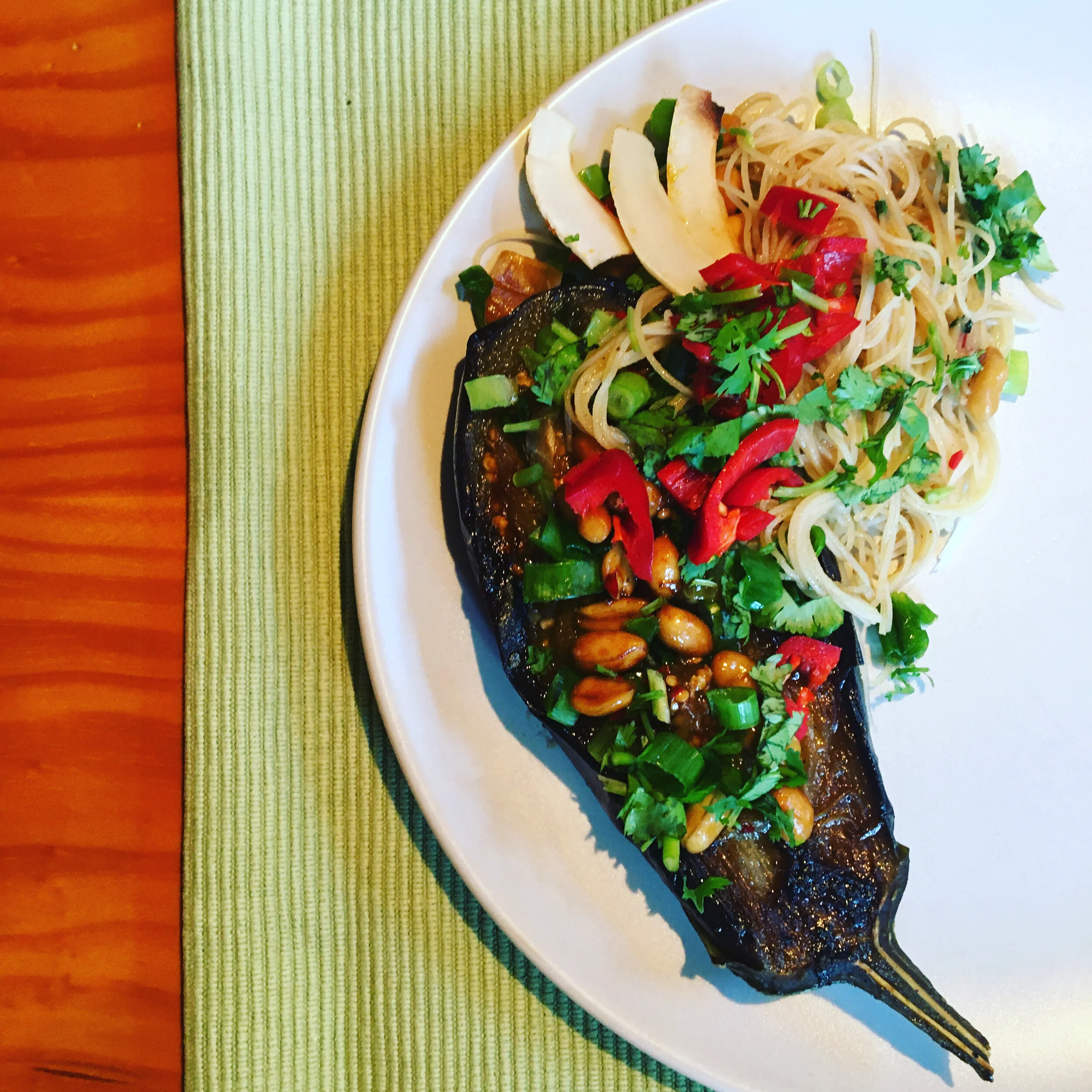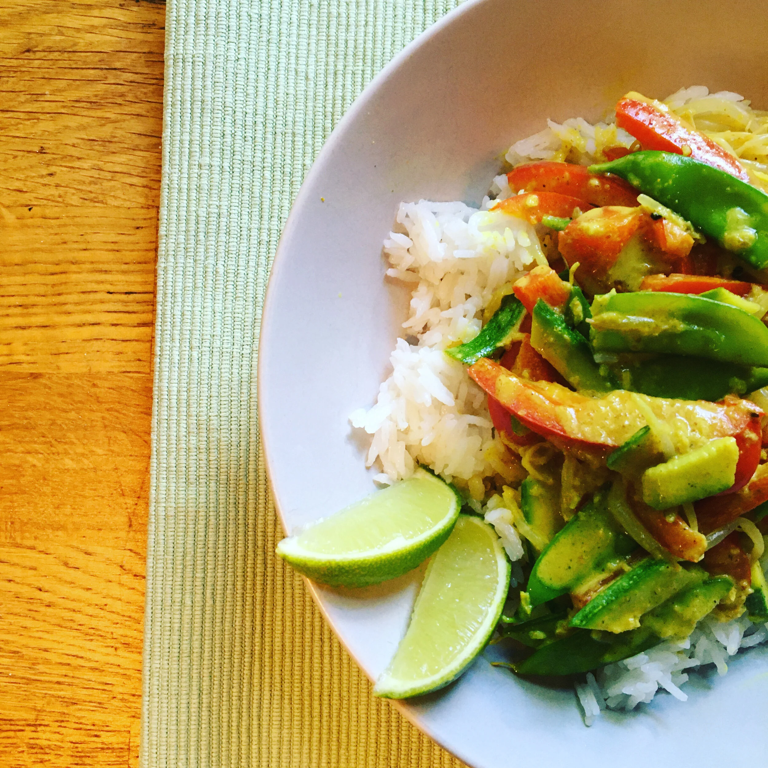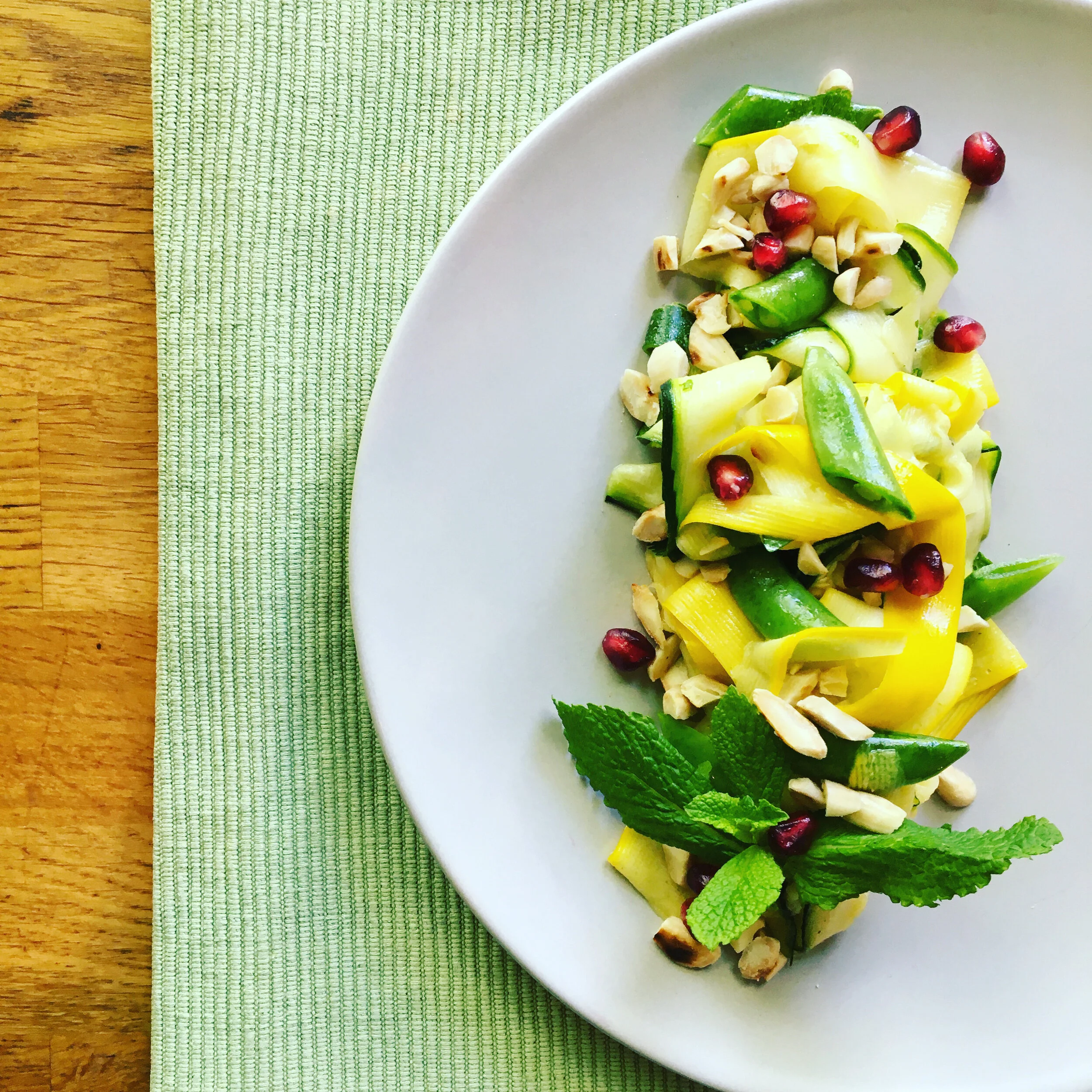 Yellow and Green Courgette with raw Mango, Sugar Snaps and Pomegranate
