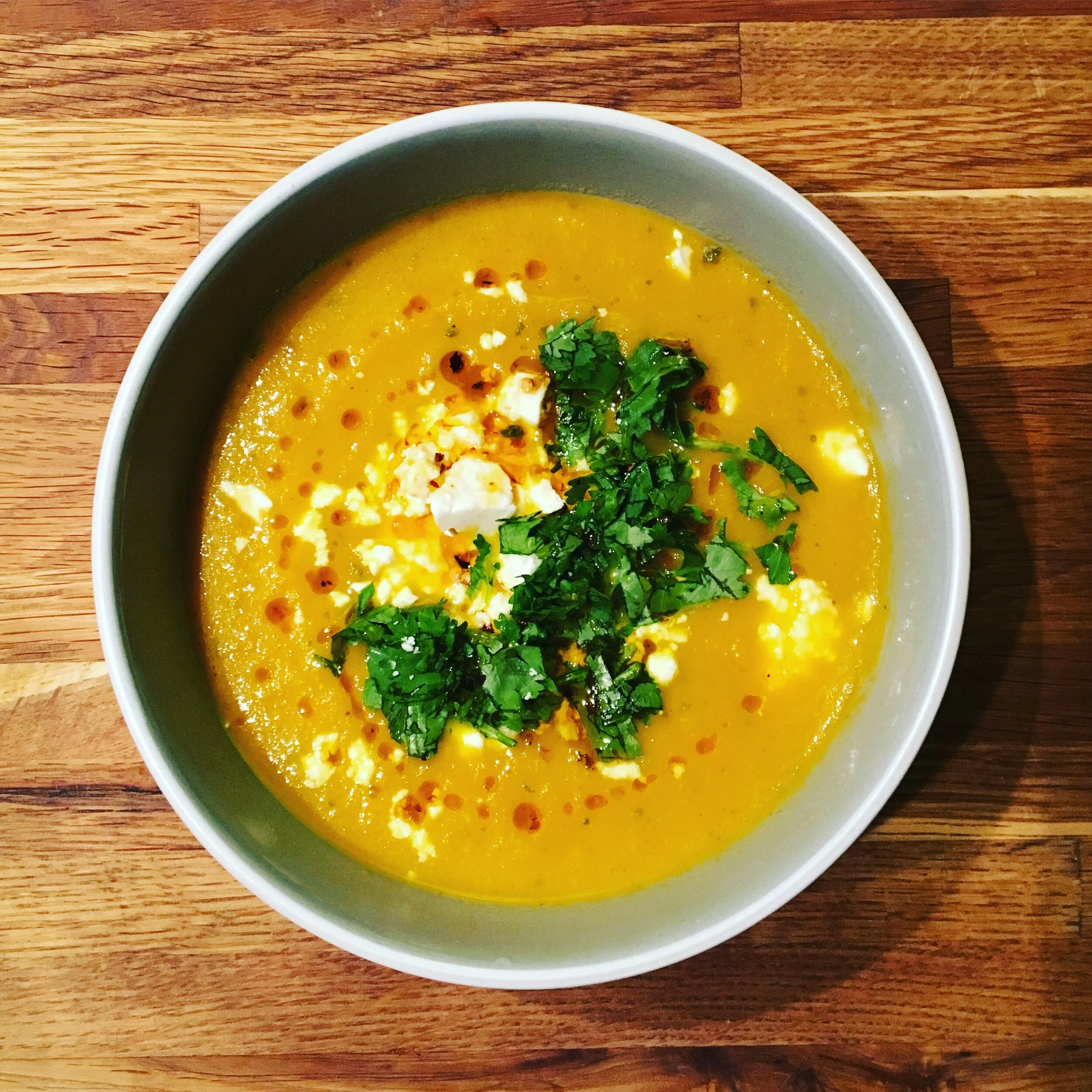 Butternut Squash Soup with Feta, Coriander and Chilli Oil