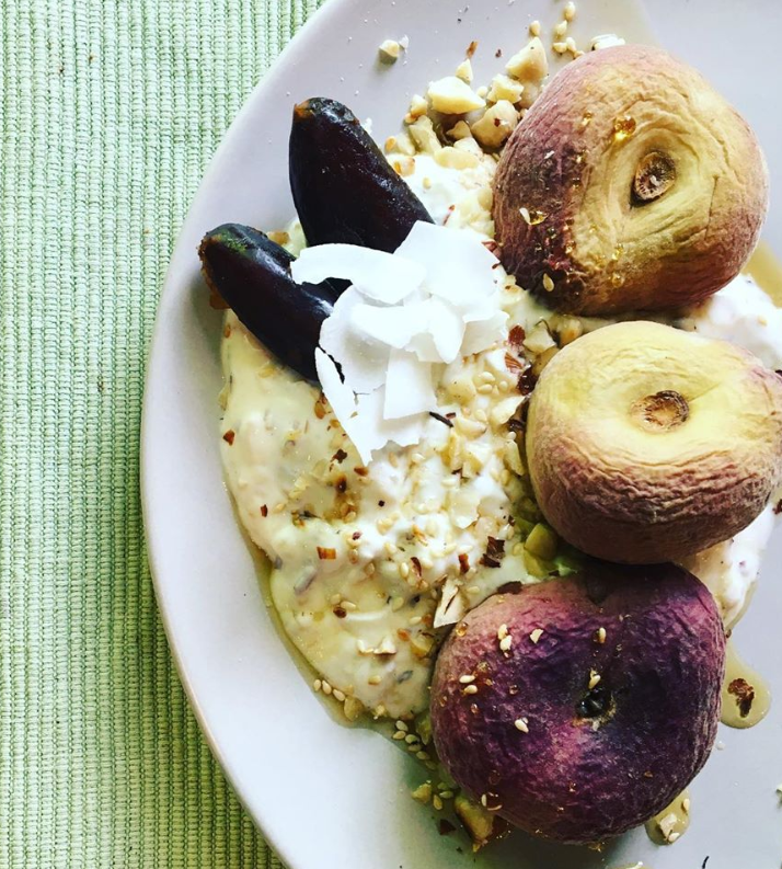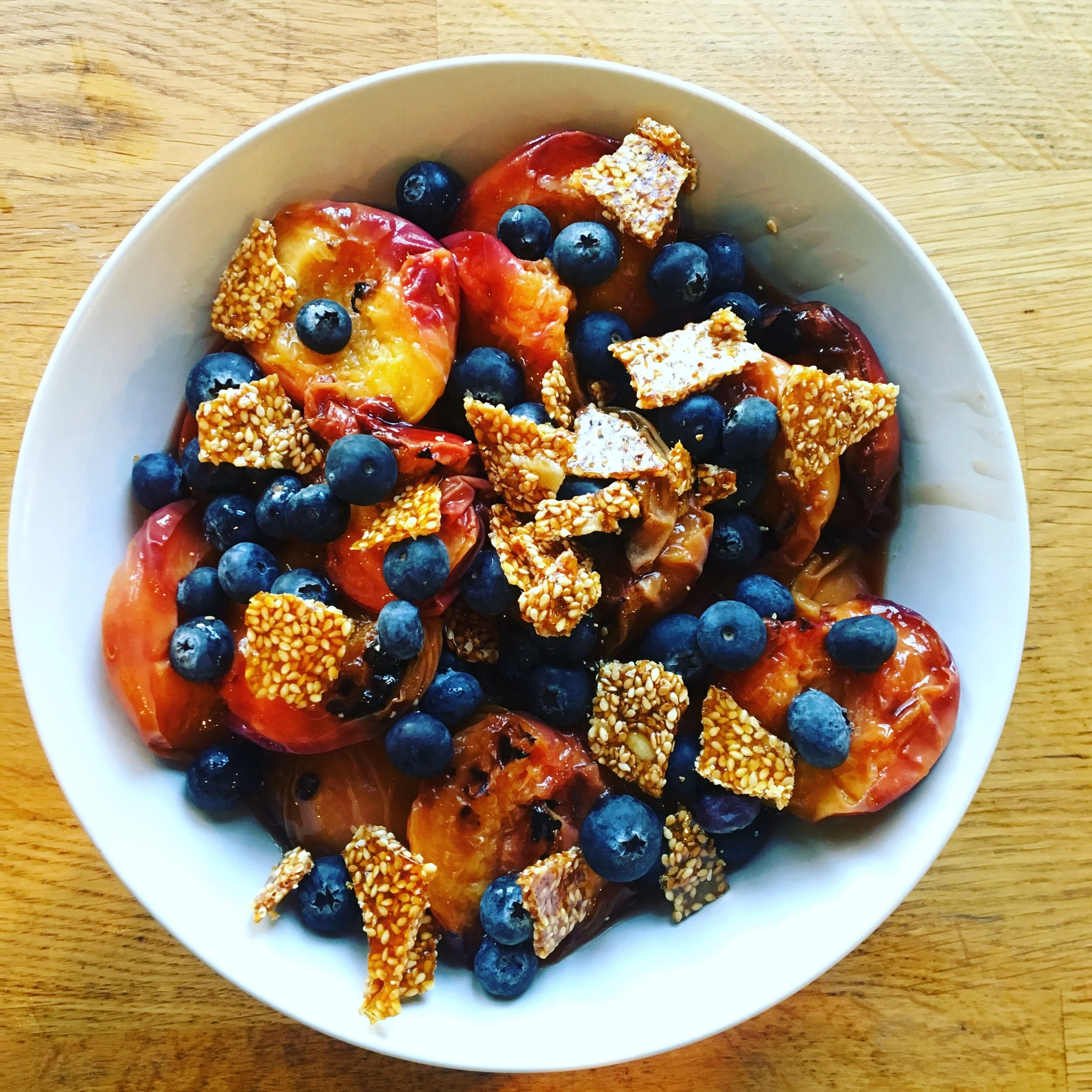 Baked Peaches with Maple whipped Yoghurt and Hazelnuts